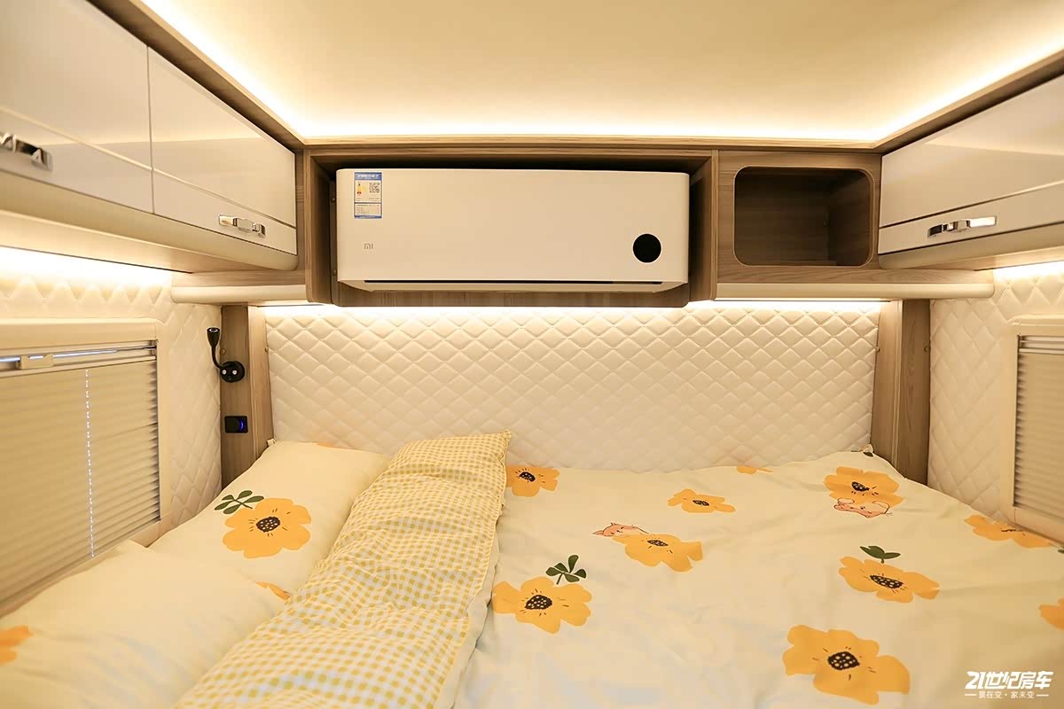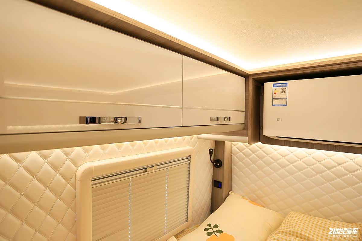 其实我个人来说比较喜欢这种比较高一些的床位,横床带来的安全感可能也更高一些。床位周边壁板上都是菱形软包,尤其是在寒冷的冬季,不用担心睡醒皮肤触碰到的地方带有冰冷的触感。车尾这张床的尺寸为2000×1300(mm),轻松地睡下2人。后床还单独为用户安装了一款小米家用变频空调。