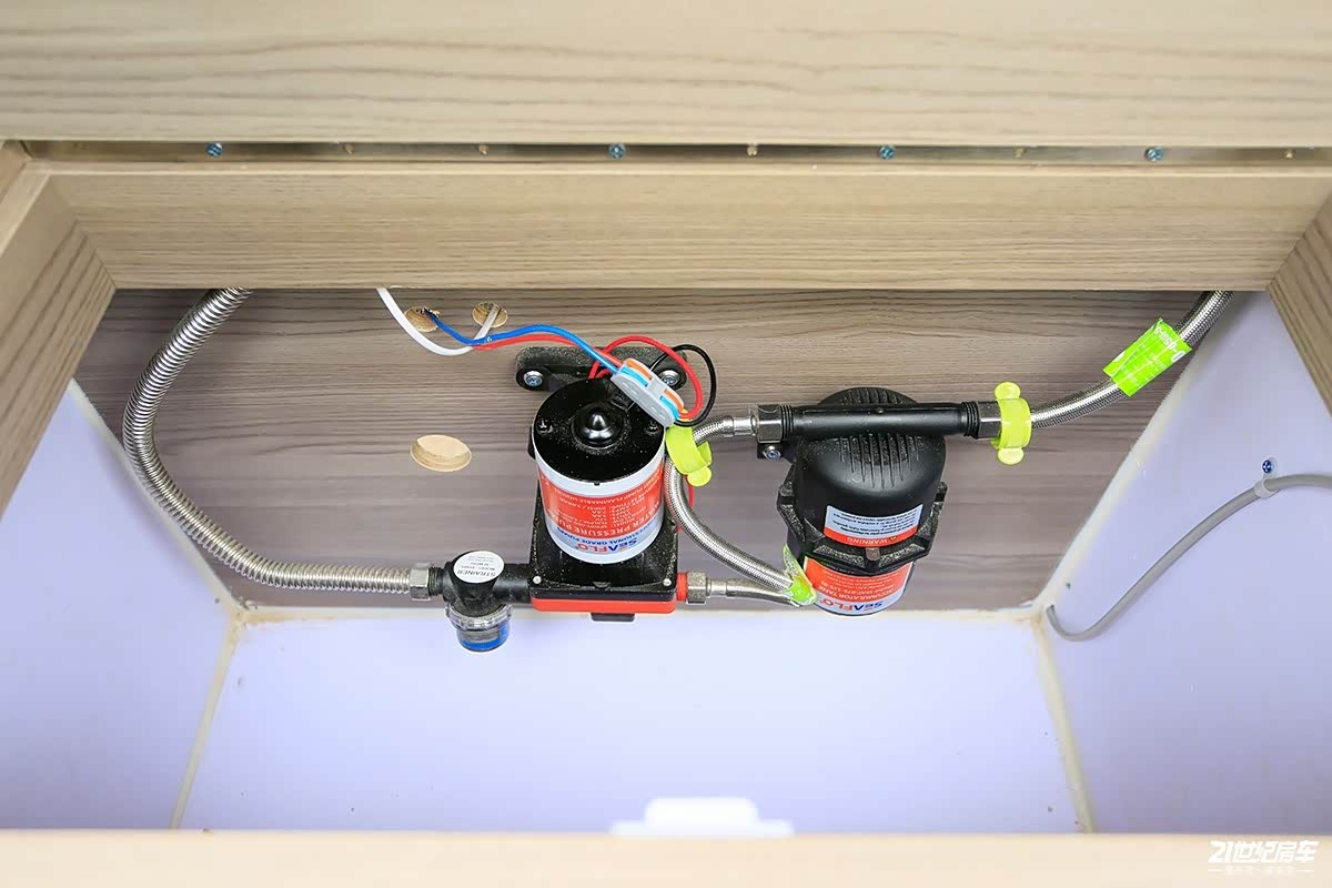另一侧隔板打开内部是水路系统的心脏——水泵,除了水泵以外还有不少余量,用于储纳其他行李物品。