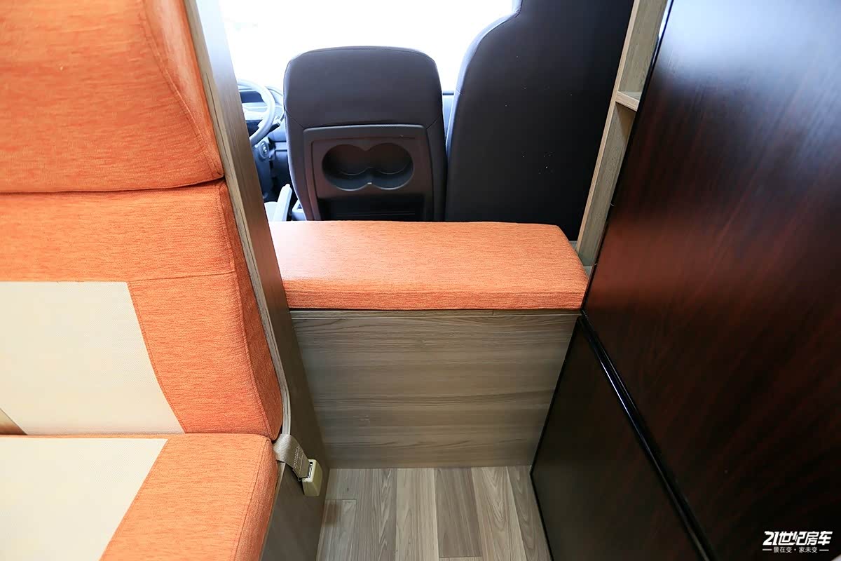 驾驶室后方到生活区的中间过渡位置是长条沙发凳,会客区人多的时候这里也能临时坐下一个人。