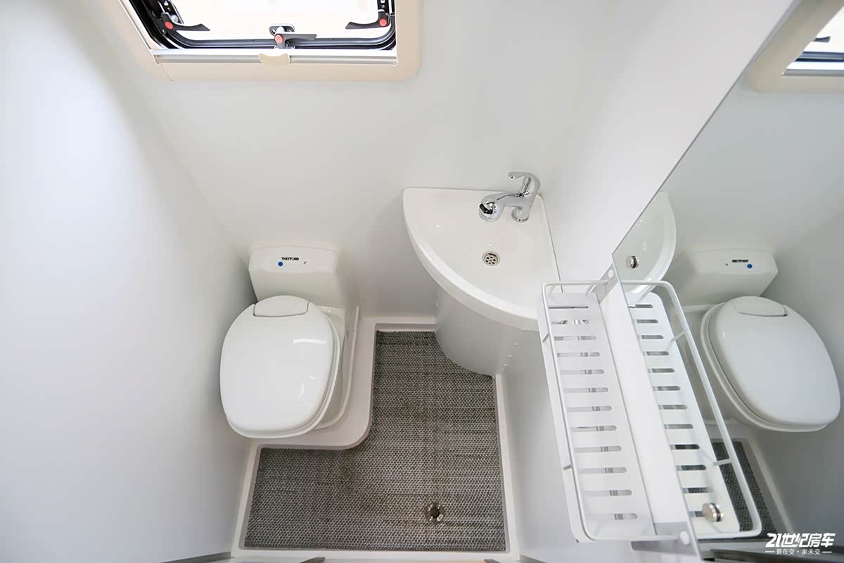 平头房车另外的一个空间优势是:在不影响其他区域空间的前提下还能保证卫生间内的大空间,这是其他底盘C型房车很难比拟的。新飞H300尊享版的卫生间目测一下几乎可以说是近似正方形,内部淋浴左右来回走动也不易碰到卫生间壁板。卫生间内还配备了扇形洗脸盆,毛巾架,赛特福德可旋转马桶,大尺寸化妆镜等等,满足日产所需基本够用。
