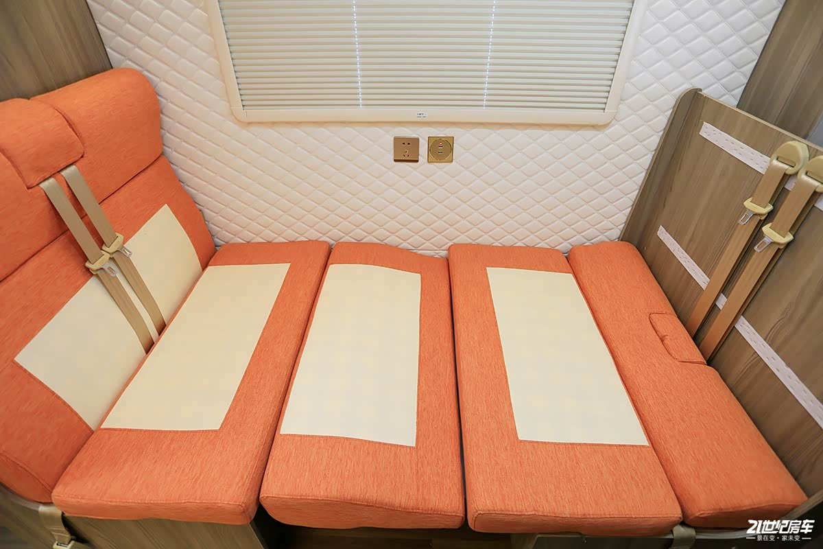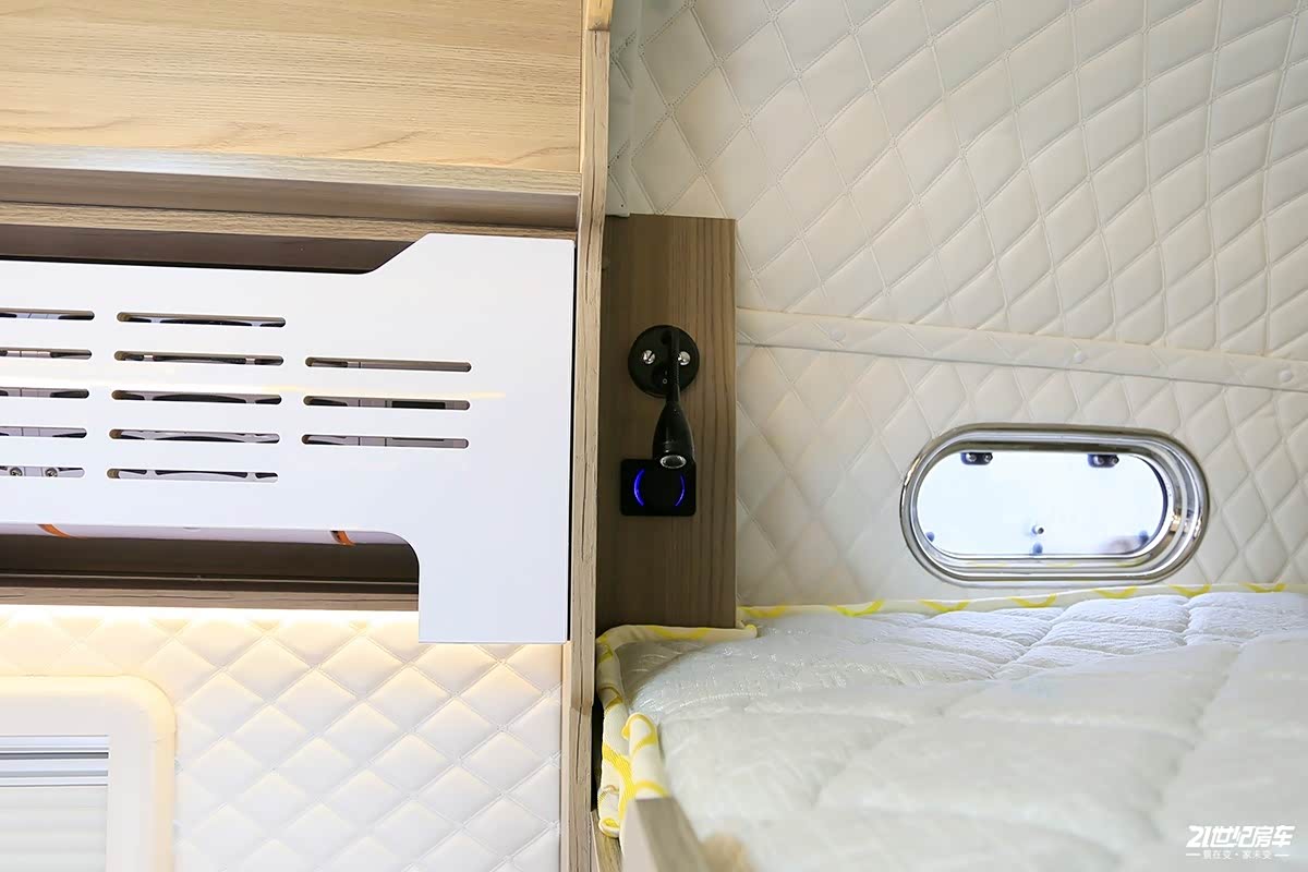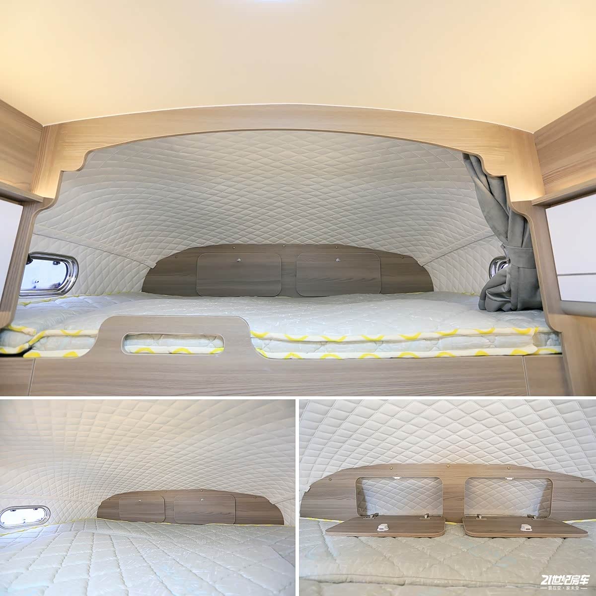 和以往车型的额头床不太一样的是,新飞H300尊享版的额头内部是巨大的拱形,一名成年人坐在额头床外侧几乎可以挺直腰板坐立。在舒适性上,通过菱形仿皮包覆来提升居住环境,最内侧还有一组储物格,用于睡前随身物品收纳。这张额头床的尺寸为1.9米长,1.4米宽。