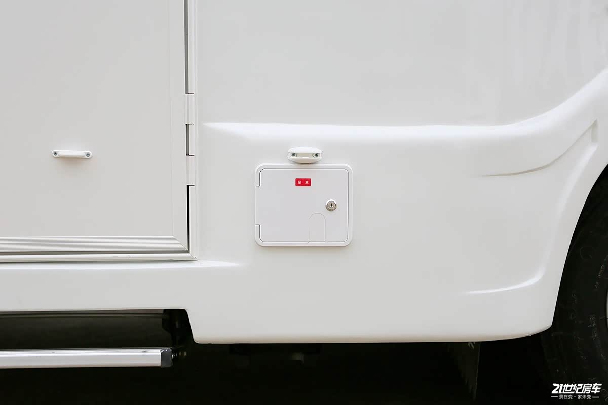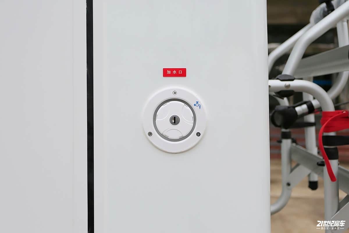 车尾是这款车的重力加水口,新飞H300尊享版标配300升净水箱,灰水箱67升,且灰水箱使用的是电动排污阀。