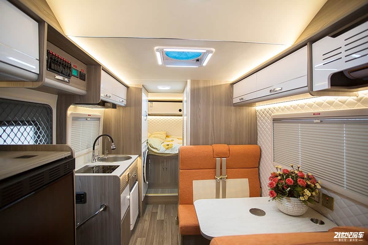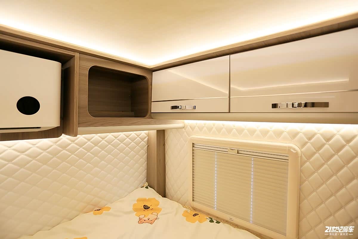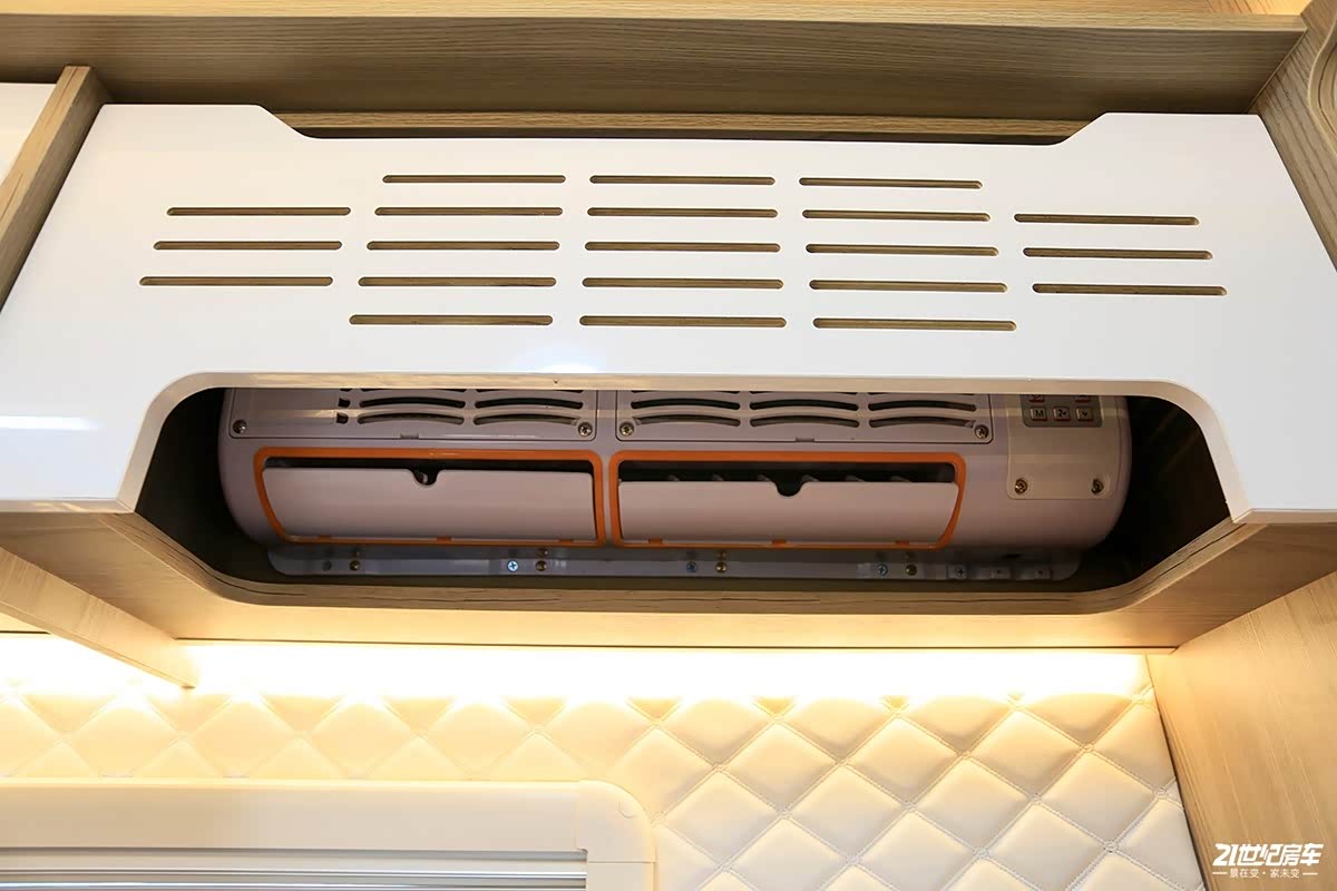 会客区顶部采用2+1形式,2个储物吊柜+一款12V直流变频空调,这款空调行驻车的时候都能使用,我觉得意义更大的是在夏季行车的时候使用,主要为客厅区域乘客提供舒适的温度。