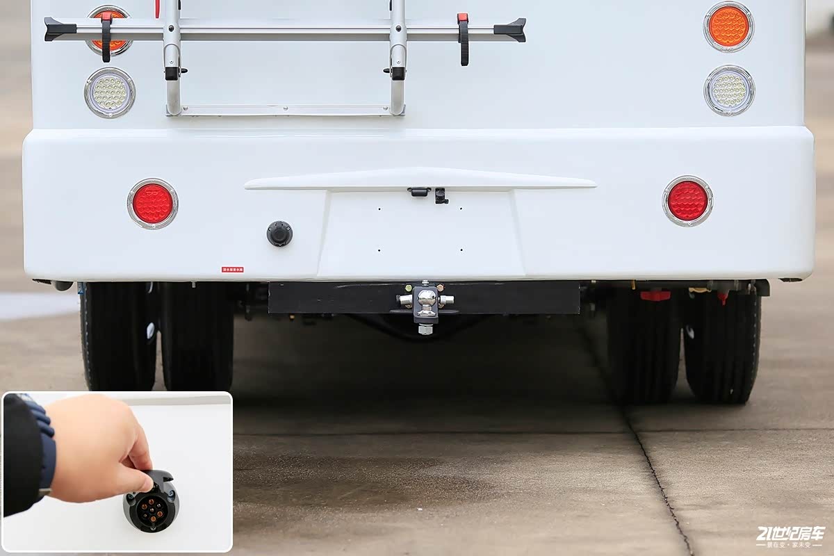 车尾简约到只有一面白色的墙板,还在厂家安装了行李车架和后爬梯,不那么单调。整车标配了四路监控系统(前后和左右4枚摄像头),可通过手机app远程查看车身周围情况。