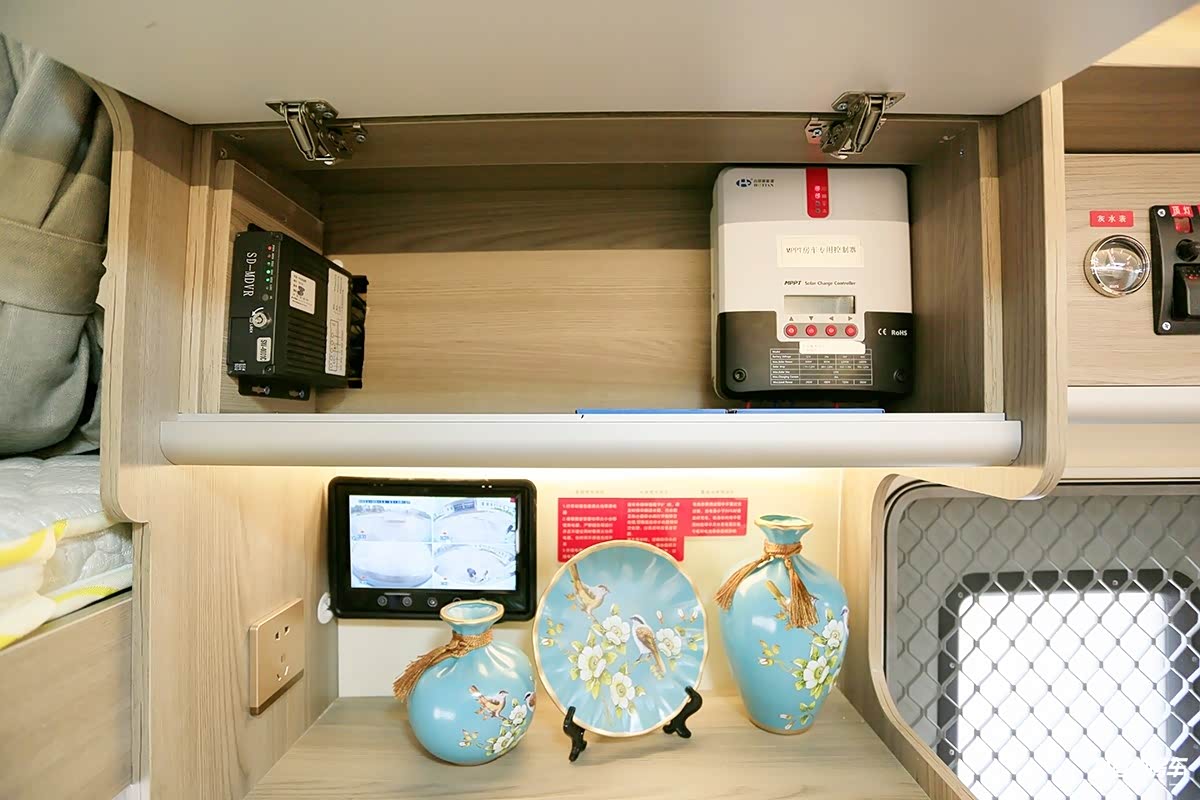 冰箱上方的储物台带有220V电源插座和四路监控系统大屏幕,平时这里可以烧水或者是煲米饭,家中带有儿童可以避免烫伤。顶部吊柜内是一款太阳能控制器,就是我们俗称的MPPT,新飞H300在车顶包含额头部分铺设了1000W的太阳能电池板,几乎算是一个满配的状态,MPPT控制器可以有效的捕捉一天当中太阳光照时候最大的发电功率。