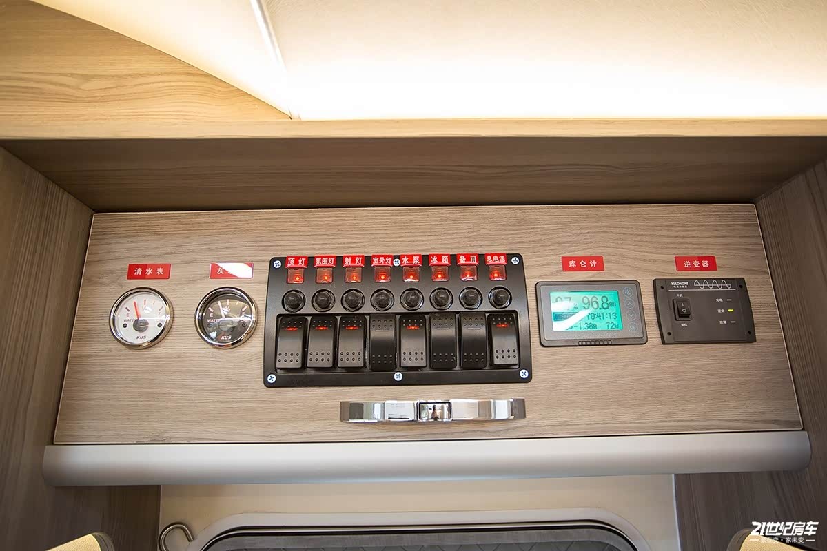 中门顶部的总控制面板全部为机械式按键,照顾老年用户的使用习惯。这款车电路系统方面,标配48V 200Ah锂电池,3000W逆变器,4000W底置发电机和1000W太阳能电池板,电力的配置数据确实非常高。