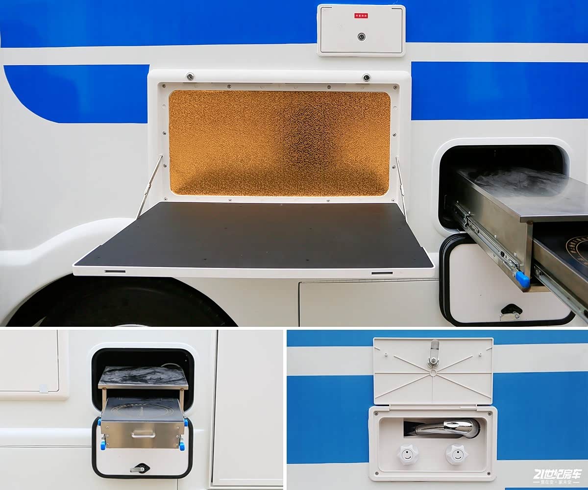 户外厨房三件套,外置淋浴兼具取水口、户外折叠桌板和一款无明火柴油灶。