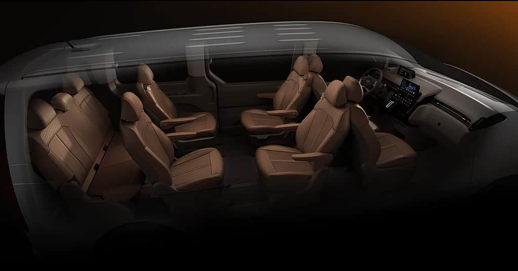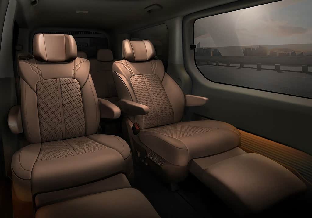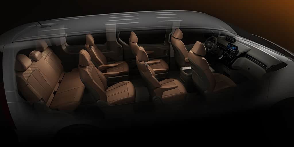 方正的造型可以更好的利用车内空间,因此现代STARIA提供了从2座到11座的多种座位布局,其中7座布局时,第二排的休闲座椅配备一键放松模式,可以自动倾斜并调整到乘客最舒服的状态,9座车型的第二排座椅可以旋转180度,与第三排乘客面对面,方便交流。