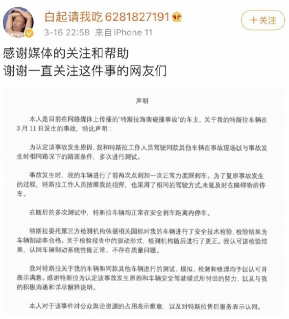 2021年3月11日,海口一位特斯拉Model 3女车主爆料刹车失灵,撞了墙。但是一个星期后,她又发道歉信说车辆没问题。