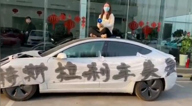 2021年3月9日,河南安阳一名特斯拉女车主手持喇叭坐在特斯拉Model 3车顶维权。