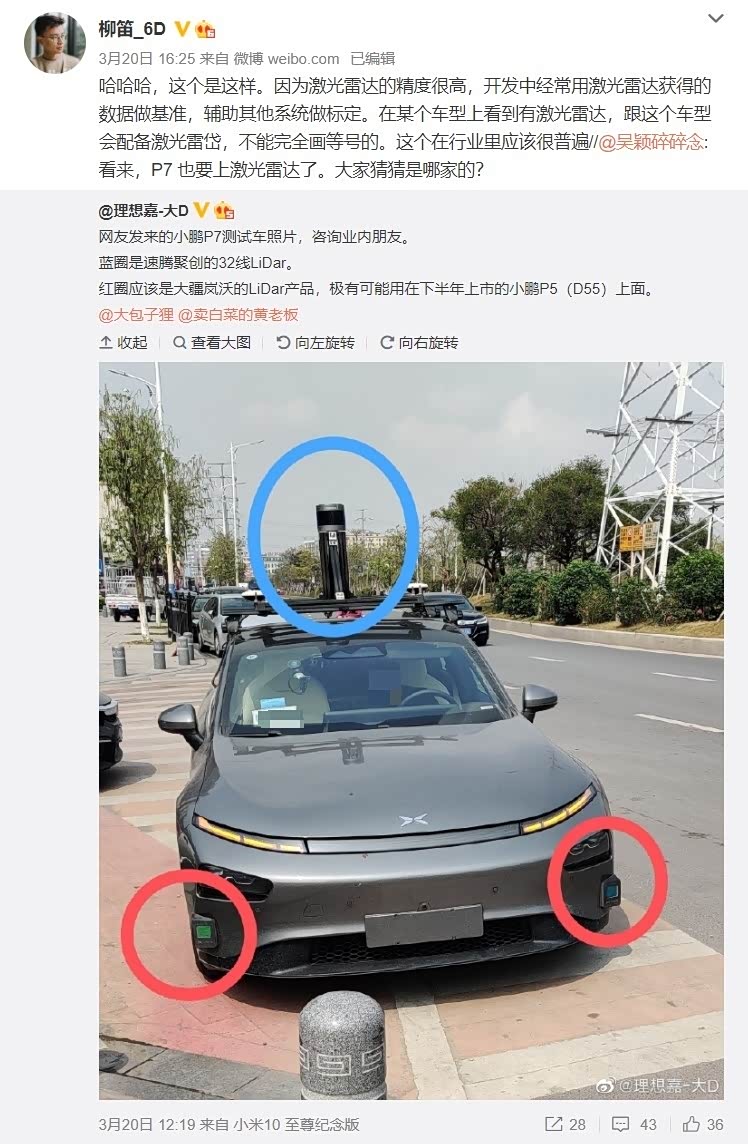 近日,根据微博用户 @理想嘉 - 大 D 消息,近日小鹏 P7 测试车的照片被网友拍到,车顶装有支架,安装有激光雷达,车头两侧也具备 LiDar 激光雷达。该微博用户表示,通过询问业内人士,可以获知车顶的雷达是速腾聚创出品的 32 线激光雷达,车头两侧的型号为大疆 Livox 激光雷达。小鹏 P7 测试车使用这几种雷达进行测试,有望应用到今年下半年上市的小鹏 P5 上。根据此前小鹏官方发布的最新消息,其新车D55(或命名P5)将搭载激光雷达,而激光雷达将在P7的改款车型中出现。