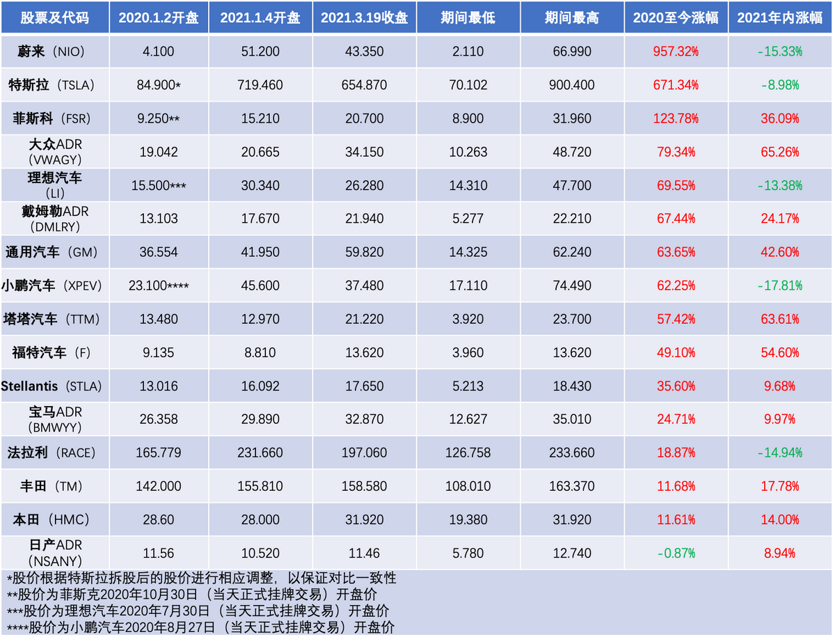前面已经提到,绝大多数美股的汽车股自2020年以来都呈上涨态势,所不同的是,2020年主要为造车新势力拉动的上涨,进入2021年,传统车企开始逐渐发力。大众、通用、福特、塔塔四家车企近3个多月的股价涨幅都在40%以上,大众和福特涨幅分别领跑欧洲和美国车企,达到65.26%和54.60%。法拉利则成为今年年内美股唯一股价下跌的传统车企。