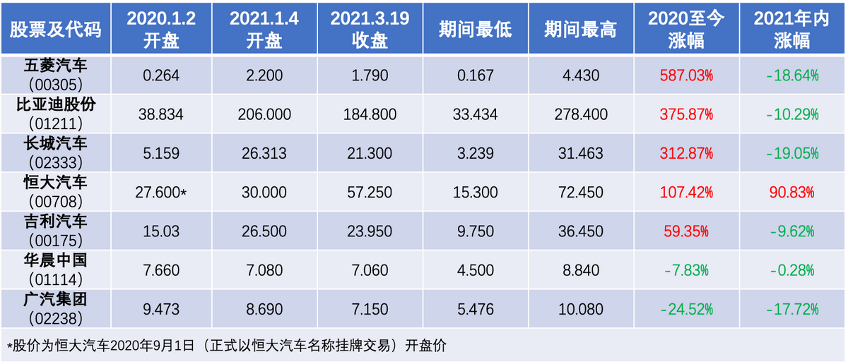 在统计范围上,则主要从两个维度进行考察。其一,是2020年至今的股价变动情况,即自2020年首个交易日(1月2日)至2021年3月19日为止的数据;其二,则是2021年内至今的股价变动情况,即自2021年首个交易日(1月4日)至2021年3月19日为止的数据。
