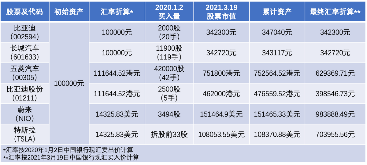 为了更好地量化这种回报,我们假设初始资产为10万元人民币,我们看看如果在2020年1月2日分别分别购买A股比亚迪和长城、港股五菱和比亚迪、美股蔚来和特斯拉,并且坚持到3月19日,不考虑交易手续费的情况下,会带来多少收益。