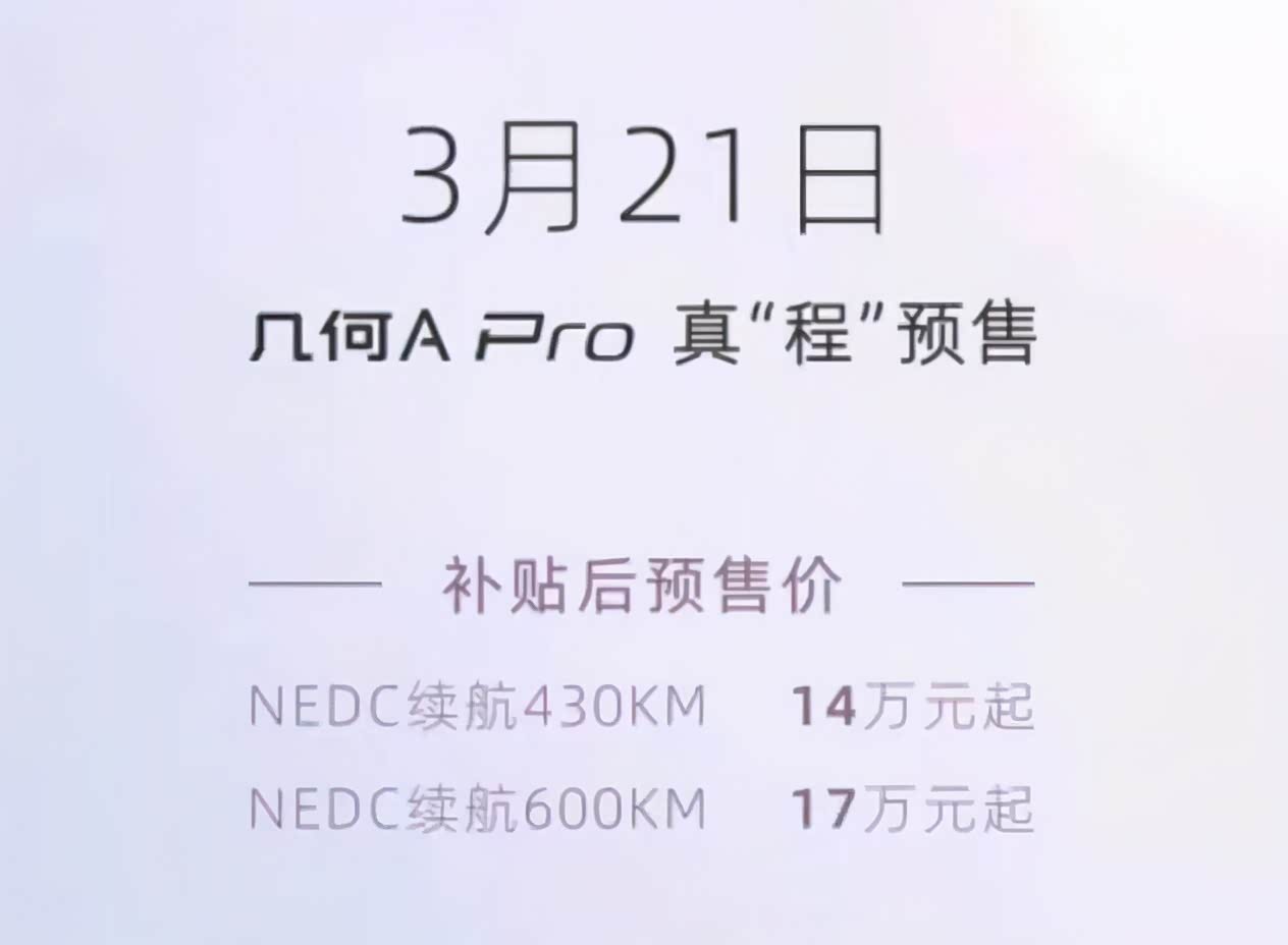 所以对于吉利而言,最重要的就是提升销量。最近我们得到消息,几何A Pro开启预售。预售价为430公里续航版本,14万起。600公里续航版本17万起。600公里续航的版本使用了镍55新型NCM523电池。这也是它价格比较贵的原因。