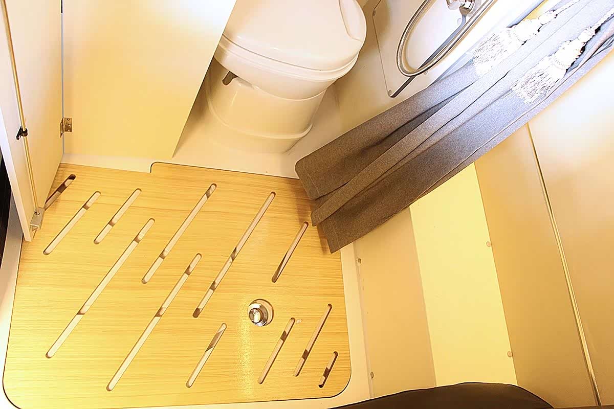 车尾就是卫生间区域了,少见的在B型房车上配备了固定式坐便器和独立淋浴器,虽然车型小巧,但C型房车有的功能它都有。