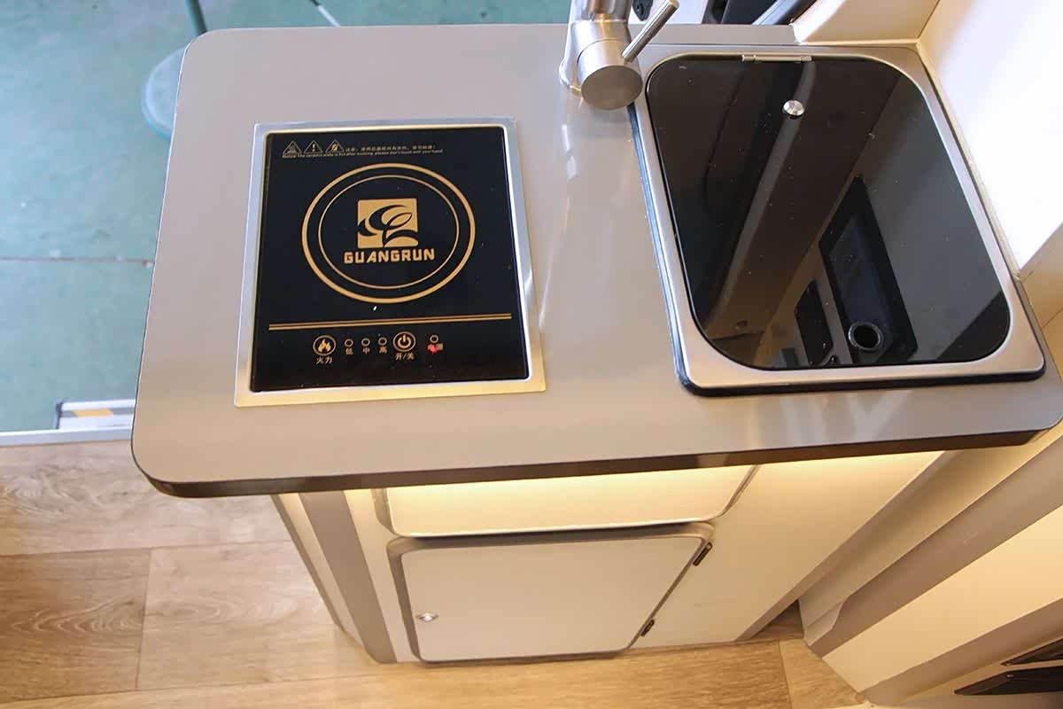 厨房设计在靠近车门的一侧,而且车门还是整体侧拉的结构,这样的好处就是使用灶台的时候,开门通风油烟可以很快散去。