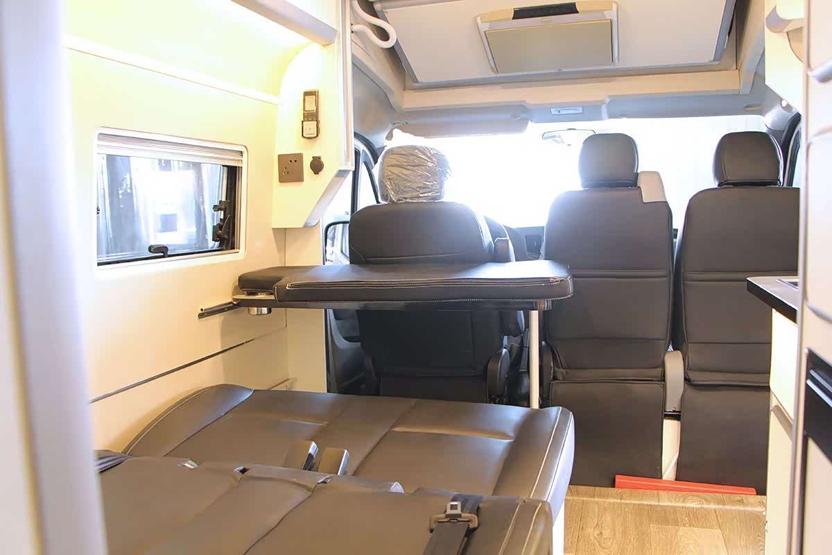 这款房车的布局利用到了加高车顶的优势,没有设计固定床位,整体空间分为卡座沙发、厨房及卫生间,这样各区域都能拥有足够的空间,卧室则隐藏在沙发上方,设计了电动升降床,平时收起以后紧贴车顶不占用空间。