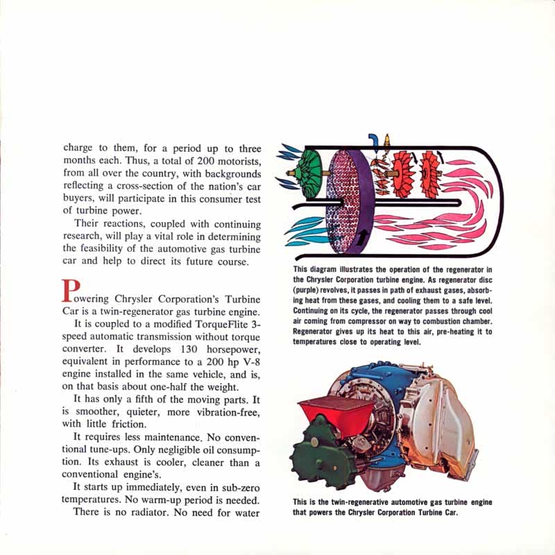 更重要的是,燃气涡轮发动机除了可以烧汽油外,还可以烧煤油、柴油、天然气、酒精等任何可以燃烧的物质。据悉,在1963年至1966年中,共有203名志愿者(20名女性)参与了测试,尽管克莱斯勒建议使用汽油或柴油作为燃料,但是仍不乏参与者为了验证燃气涡轮发动机的适应性,将墨西哥龙舌兰酒和香奈儿5号香水倒入油箱中并顺利启动。