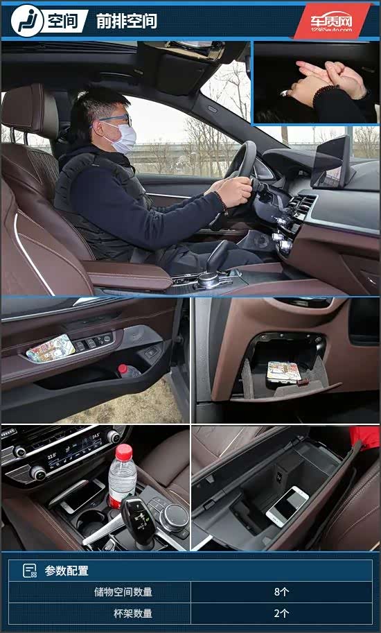乘坐空间方面,宝马6系GT整体表现绝对会出乎你的意料。身高为175cm的体验者进入前排,调整好座椅后,头部拥有一拳两指距离。储物空间方面,虽然储物数量不多,但每个储物格的位置十分合理,便于驾驶者拿取。除前门板储物槽、中央扶手箱这种常规储物位置外,挡把前方还设有一个带可推拉盖板的储物槽,内部不仅配有两个杯架,前端还设有手机无线充电装置。