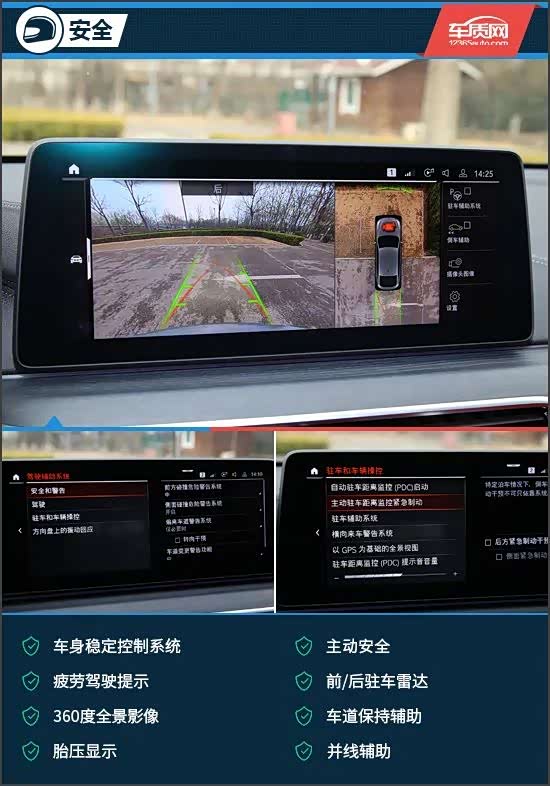 安全配置方面,新款宝马6系GT可谓武装到牙齿,其主/被动安全配置非常丰富,例如车身稳定控制系统、主动安全、疲劳驾驶提示、前/后驻车雷达、并线辅助以及上坡辅助等均有所配备。其中,全景影像各个摄像头显示效果非常清晰,且基本没有死角。另外,在车道保持系统的加持下,当车辆偏离行驶车道时,方向盘能够自动辅助回正,且力度自然,不会很突兀。