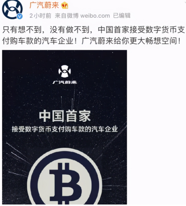 其实,虽然用比特币购车在全球范围内独一家,但是提出比特币购车的竟然是中国车企,你知道吗?早在2020年底,广汽蔚来就发了一条微博,微博内容就是关于支持比特币购车的,不过毕竟比特币并不是法定发行的,虽然广汽蔚来一度改为用数字货币支付,但最终删除了微博,比特币购车的方案也因此画上了句号。