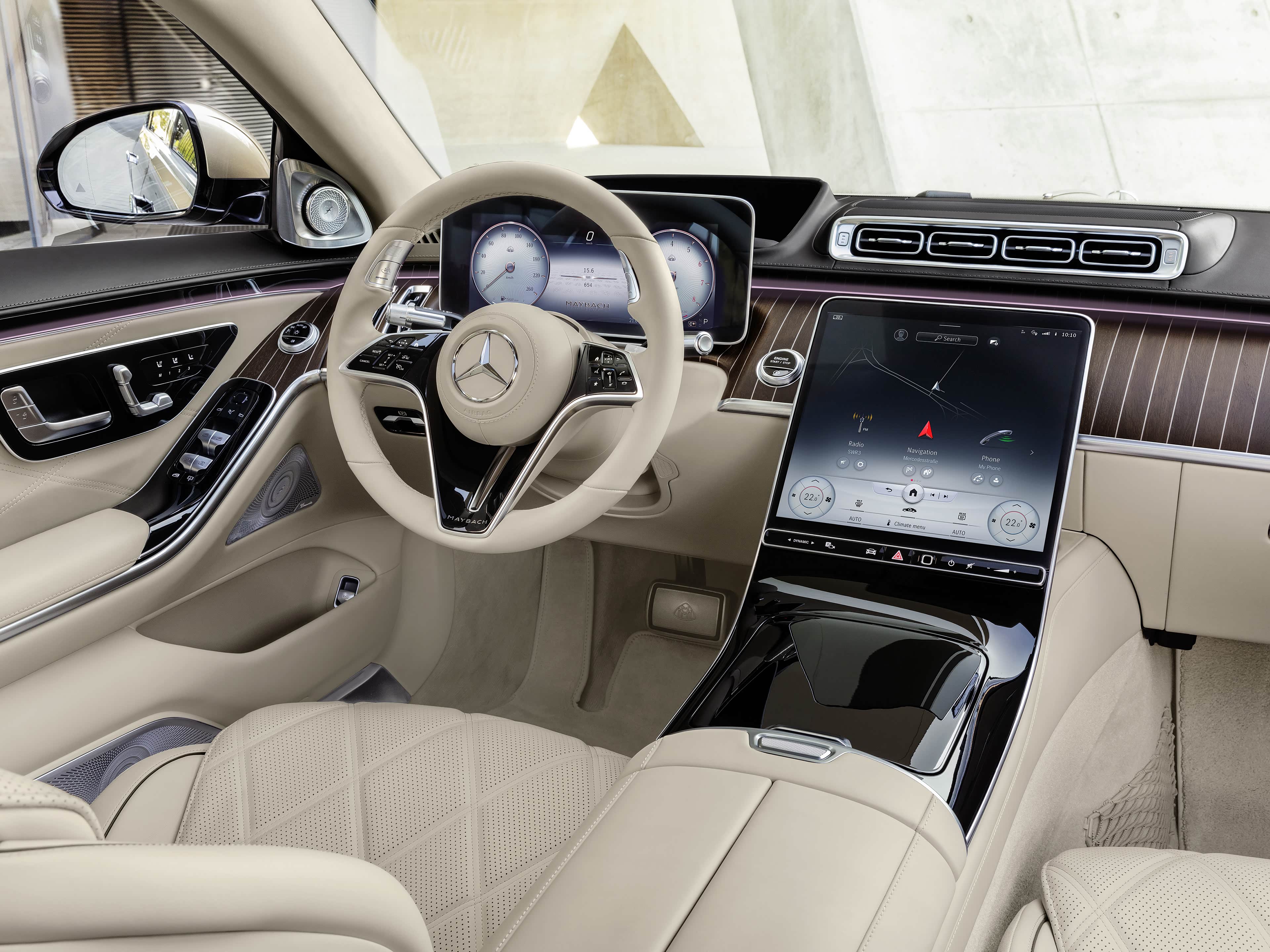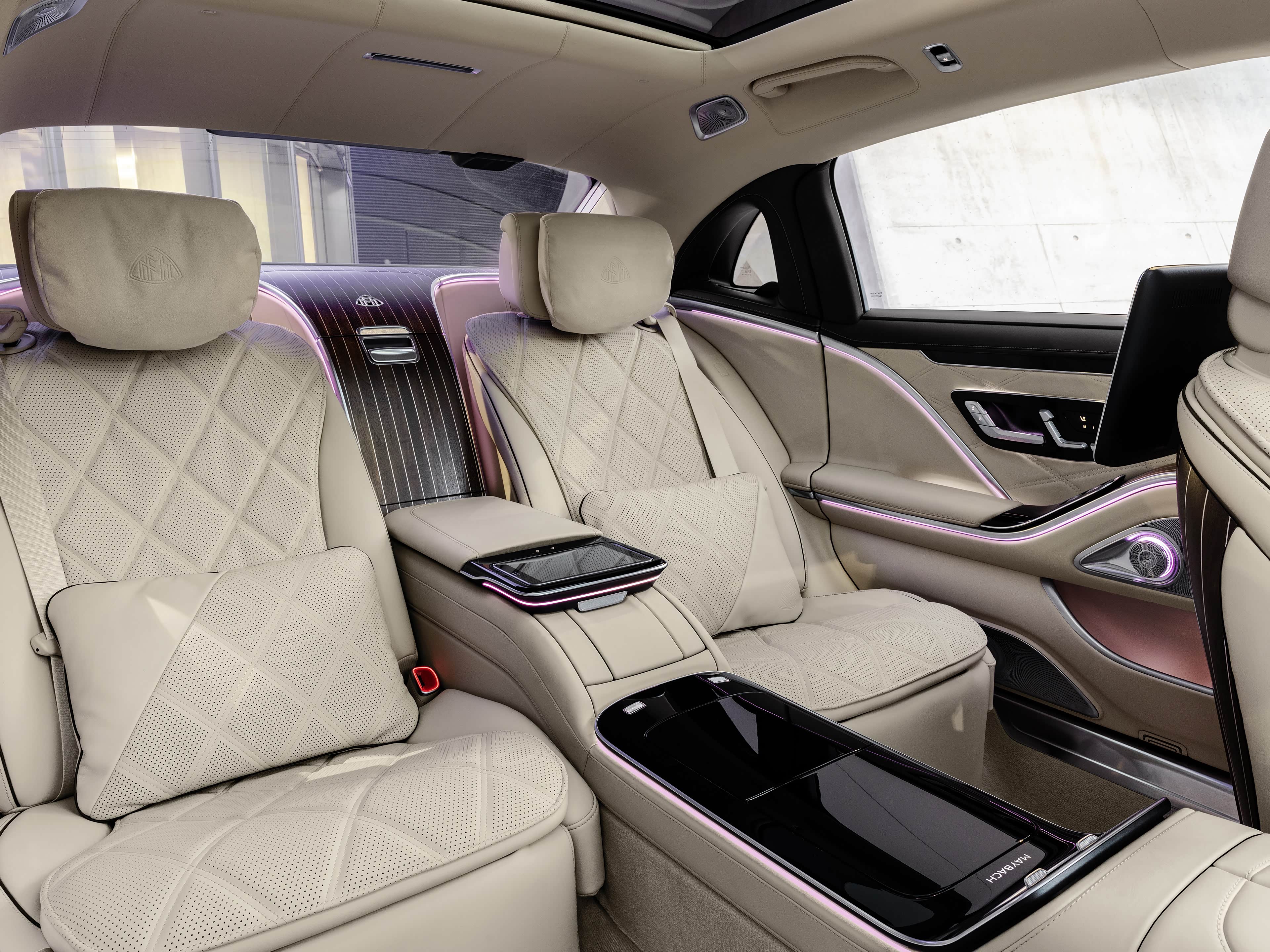 内饰方面, 全新 迈巴赫S级在保持全新奔驰S级的布局上,加入了由玫瑰金与紫水晶配色构成的迎宾氛围灯光带,以及专属迎宾界面极富启动仪式感,车内多处迈巴赫徽章展现了新车的与众不同。12.8英寸的中控屏幕搭配12.3英寸的裸眼3D全液晶仪表,增强了整车的豪华感和科技感。