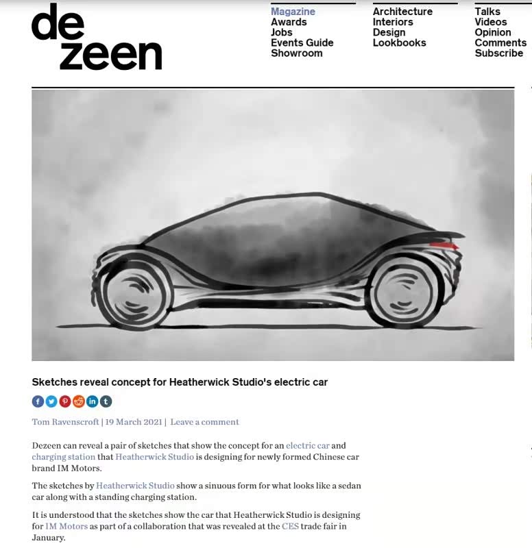 3月25日,Heatherwick Studio为智己汽车设计的全新概念车型和充电桩草图在全球最具影响力的在线建筑杂志dezeen发布。