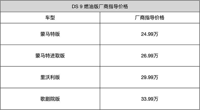 DS9 燃油版共分为:蒙马特版、蒙马特进取版、里沃利版、歌剧院版,不得不说法系车不仅设计上个性浪漫,就连车型命名也足够率性,不过对于大部分购车的消费者来说想要分辨它们可有些难度了。