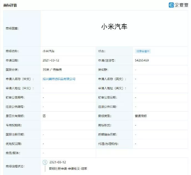 不过有意思的是,小米将与长城合作造车的消息传出后,有人立即查询到“小米汽车”商标已经被另外一家做纺织的公司抢注,实在是大写的尴尬。企查查显示,绍兴冀祥纺织品有限公司于21年3月申请注册“小米汽车”商标,国际分类为12类运输工具、35类广告销售。