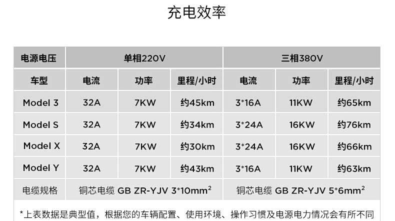 另外特斯拉官方充电桩支持单相电和三相电。这个充电桩最大支持380V32A21KW,但是实际充电功率多少是由汽车决定的。特斯拉model3和modelY车载充电机最大支持11KW,modelS和modelX车载充电机最大支持16KW。