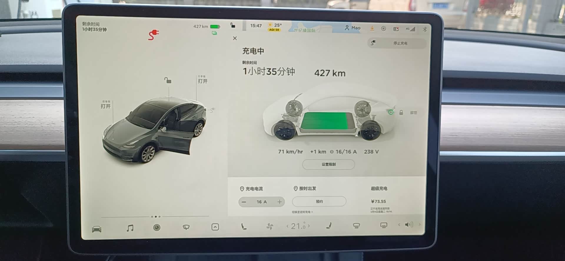 这是我的特斯拉modelY上显示的充电速度,一小时充70多公里,屏幕上有个③的图标,就代表是3相电。特斯拉modely长续航版电池容量是77度电,使用普诺得11KW充电桩就是一小时充11度电。理论计算从0到充满电的时间是77kwh÷11kw=7h,也就是7个小时。