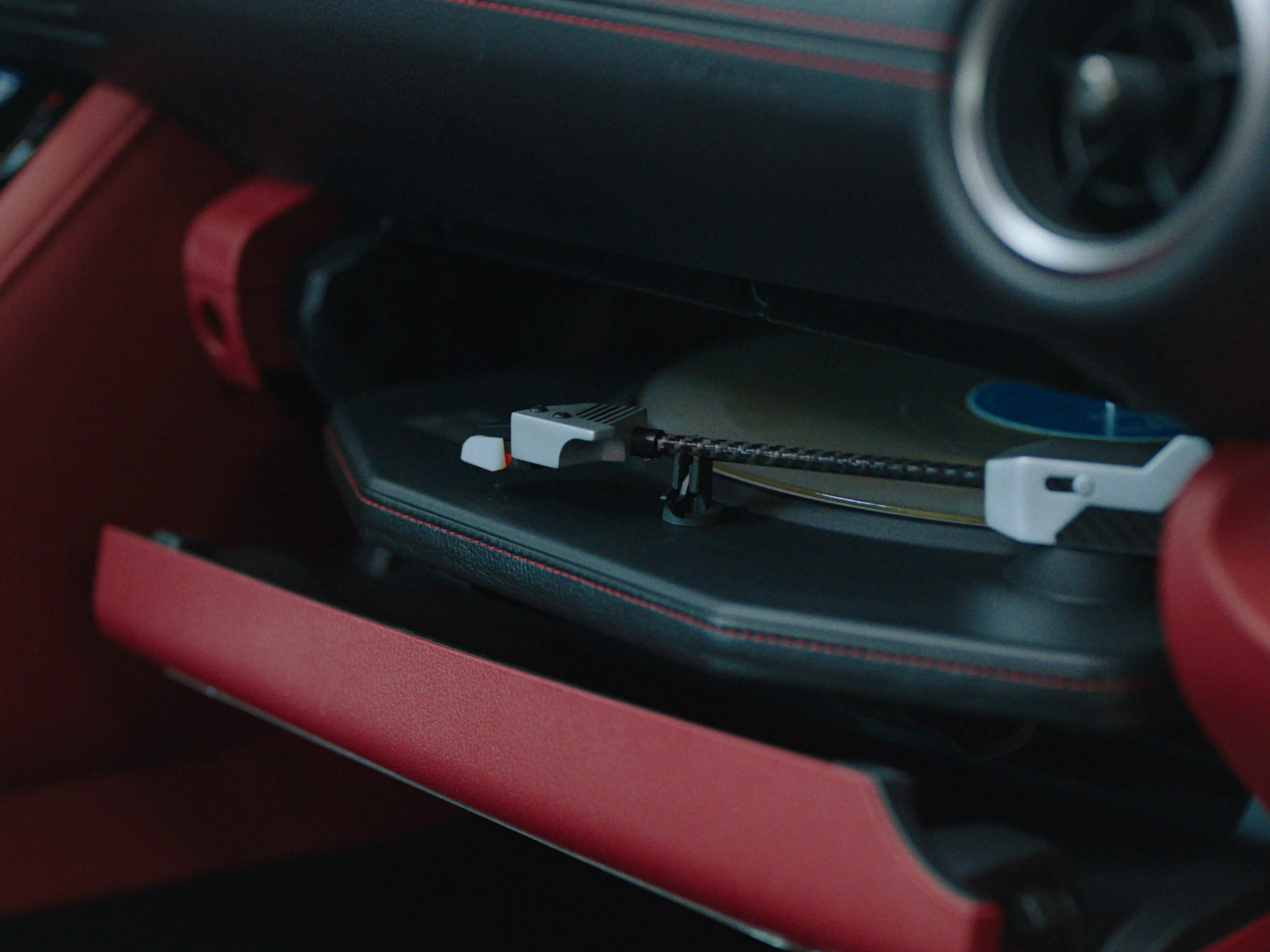 内饰方面,新车整体布局依旧保持普通版雷克萨斯IS的风格,采用了红黑配色的内饰,红黑双色皮革与红色缝线的结合看起来富有出色的质感和动感。新车最大的变化就是副驾驶手套箱的位置塞进去了一台唱片机进去,真正实现车内播放黑胶唱片的能力。为了能够保证车辆在行驶过程中不会损坏唱片机和唱片,SCPS特地开发了一种碳纤维铝合金,并将其置于硅板上,以此对唱片机和唱片形成保护。