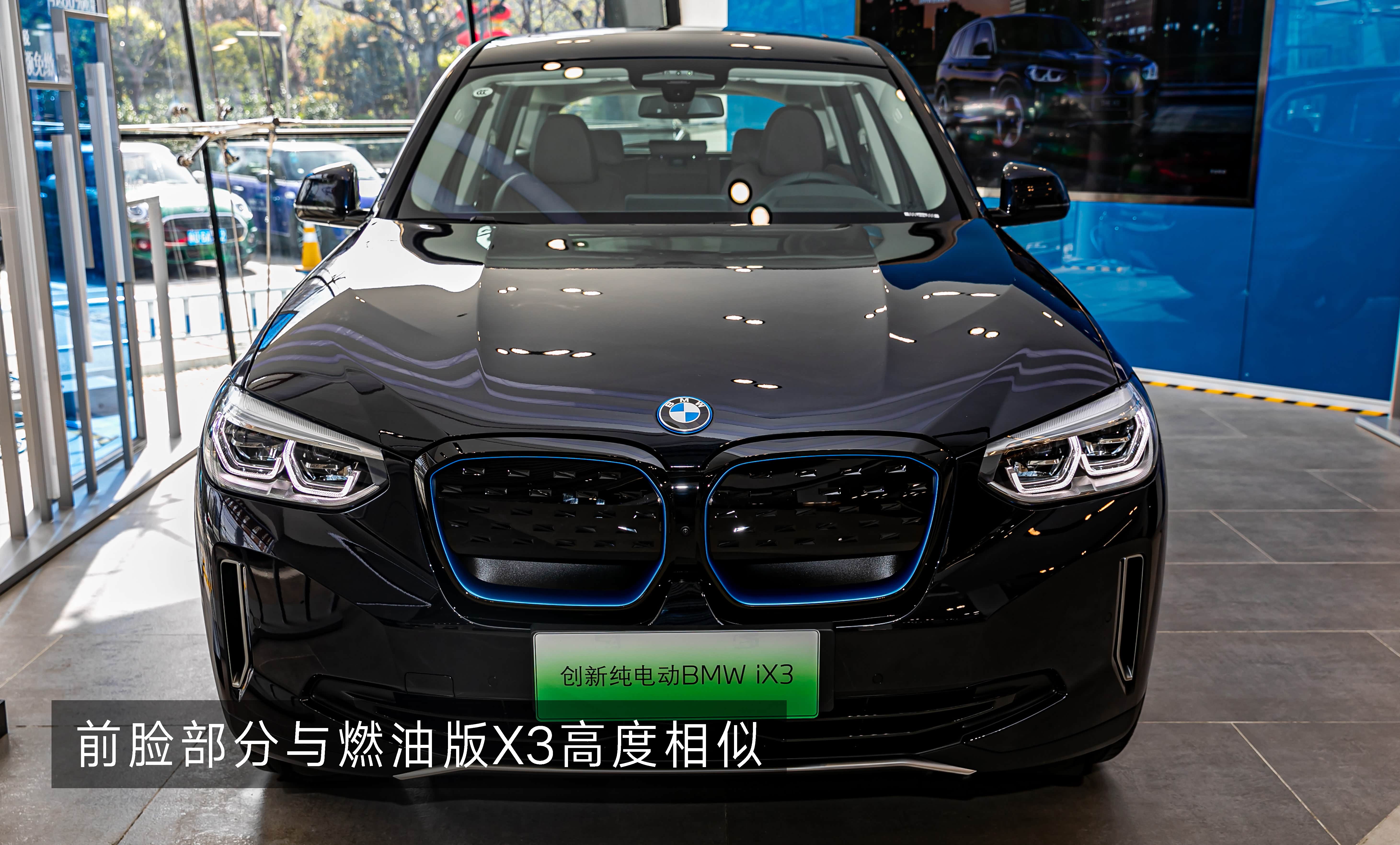 前脸部分,iX3与燃油版本的X3高度相似,区别只在细节部分。中网造型同样是宝马最为经典的“双肾型”,但内部则采用了封闭的结构。同时,两侧的进气口为细长条样式,但它的功能同样是为了刹车系统进行散热。除此之外,就是细节部分的蓝色点缀了。