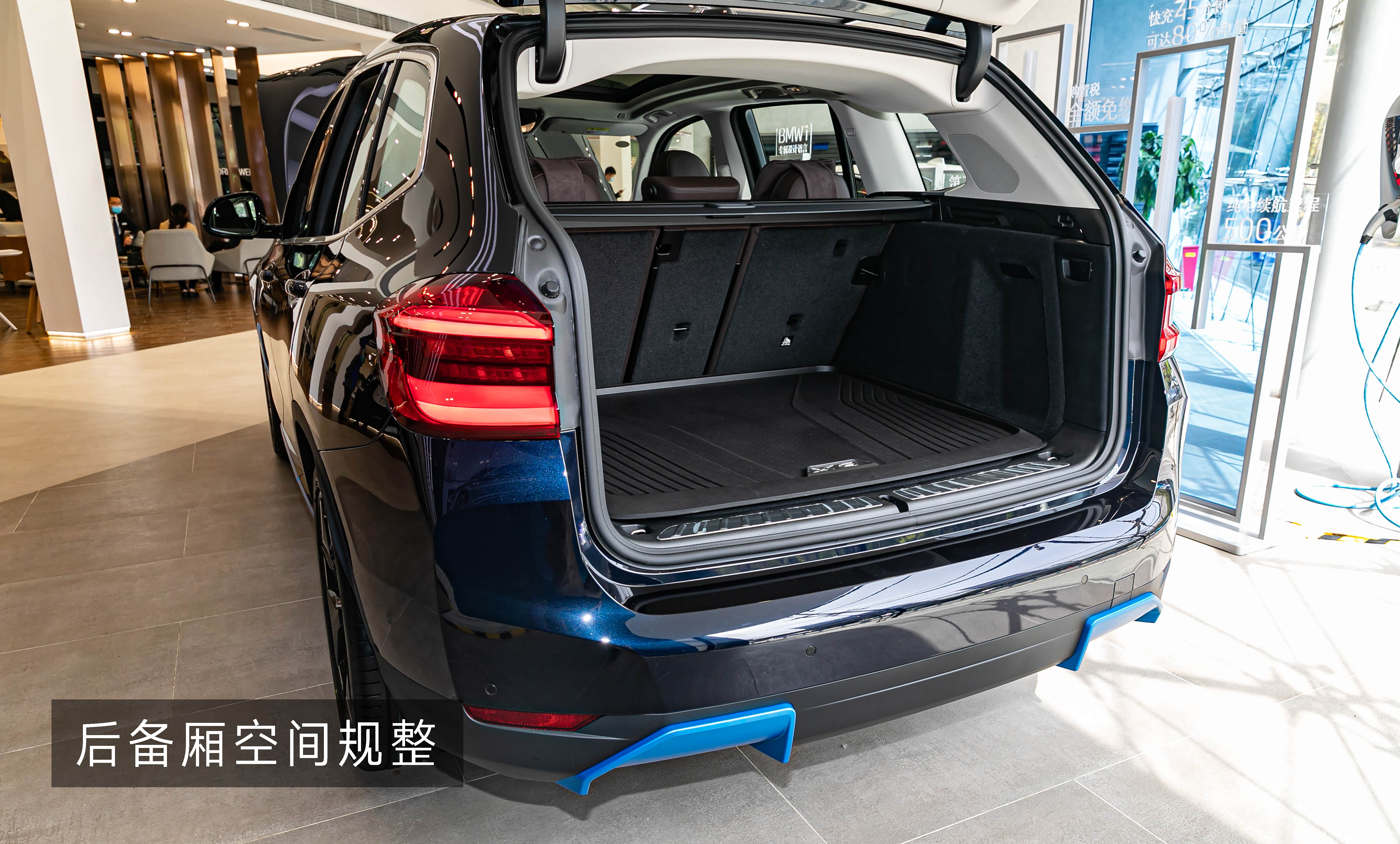 大家可能会比较关心后备厢的空间,因为iX3的电机位于后桥,不过打开后备厢无论是绝对空间还是内部构造的表现都是不错的,盖板下方还有一块儿尺寸不算大的下沉空间。