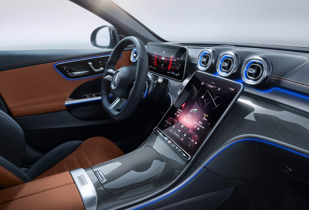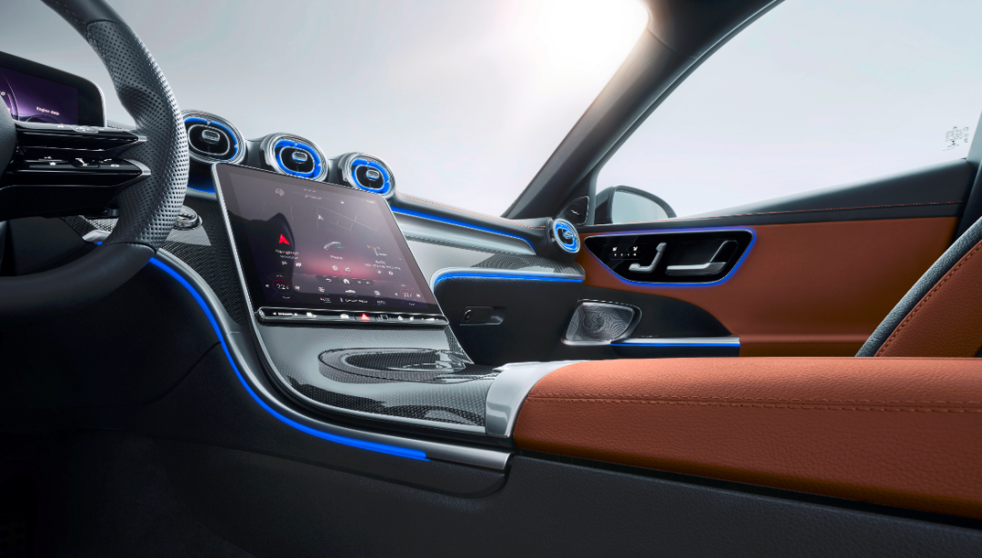 而在全新奔驰C级上,同样的内饰设计就凸显出了另外一种感觉:小巧而又灵动。虽然采用了与S级一样的屏幕,但背后的装饰板采用了多线条式的设计,就像是一件本来纯黑的西装外套加上了白色线条后会有一种淡淡的痞气在里面。并且全新奔驰C级一些车型采用了淡色系的内饰颜色设计,所以会让人感觉到这台车更年轻。女生无论怎么穿,都可以和这套内饰能够搭上。