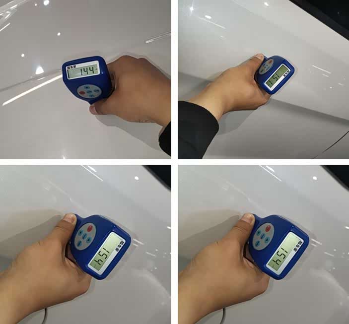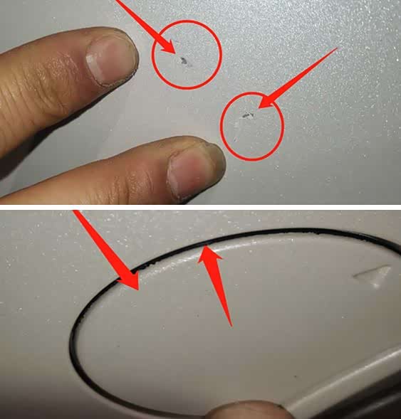 首先围绕车辆一圈,发现多处细小的划伤,不过影响不大,可以继续使用,如果确实看不下去可以去4S店简单处理一下也不麻烦,不过前保险杠有修复的情况就得小心了,先不急着下判断,咱们后面检测看看车辆前部会有啥情况。这里春哥我给大家分享一个小技巧,怎么来查看小坑?用手电筒或者手机闪光灯从侧面照射漆面,形成不到180度的角度,一下就可以清楚的观察到凹陷划痕还有漆面上的脏点。