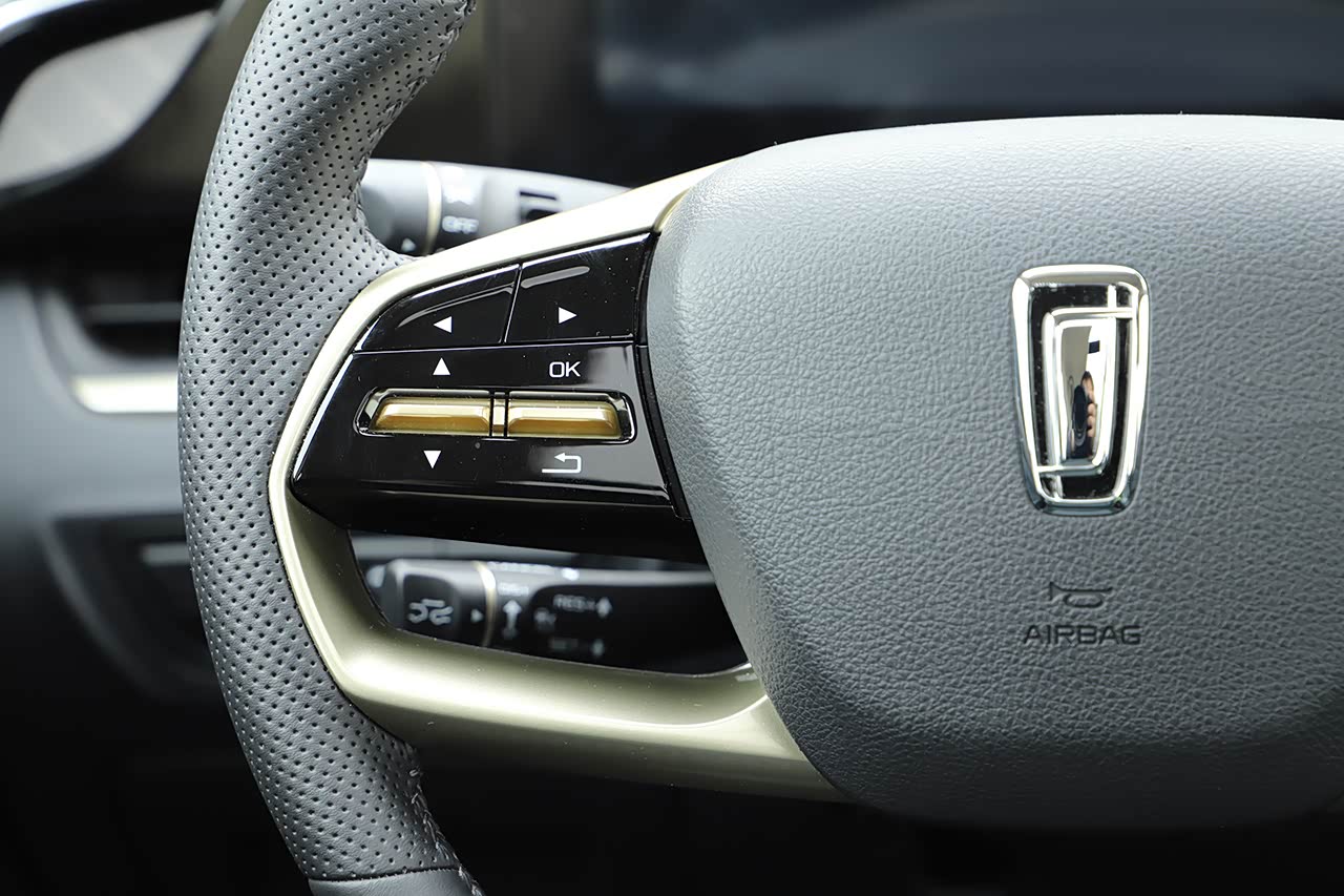 方向盘为双辐平底式设计,视觉效果上更为轻盈、豪华,两侧多功能按键布局比较简单,因为奔腾T55专门为驾驶辅助系统设置了单独的拨杆,在方向盘左侧靠下的后方。