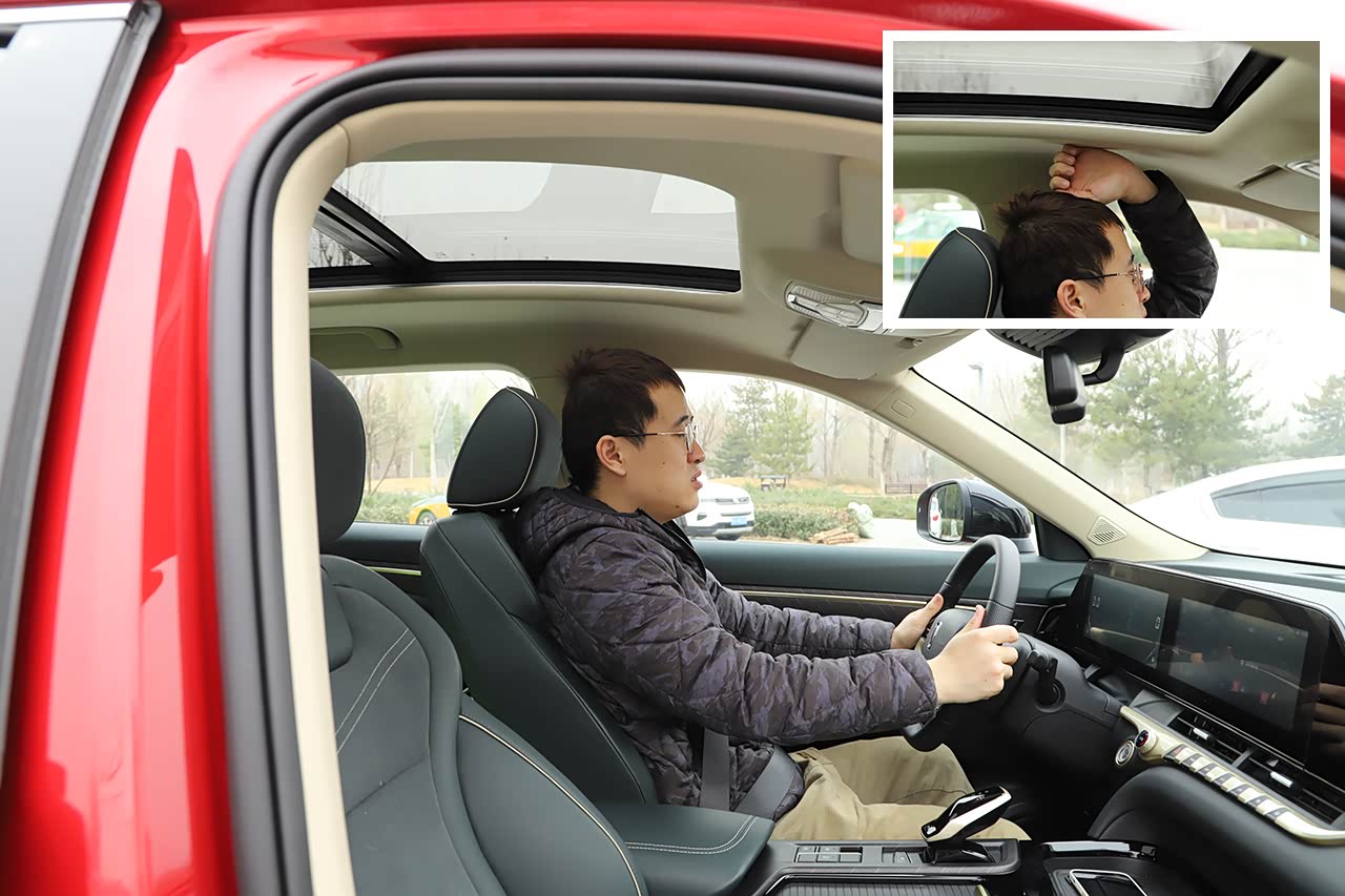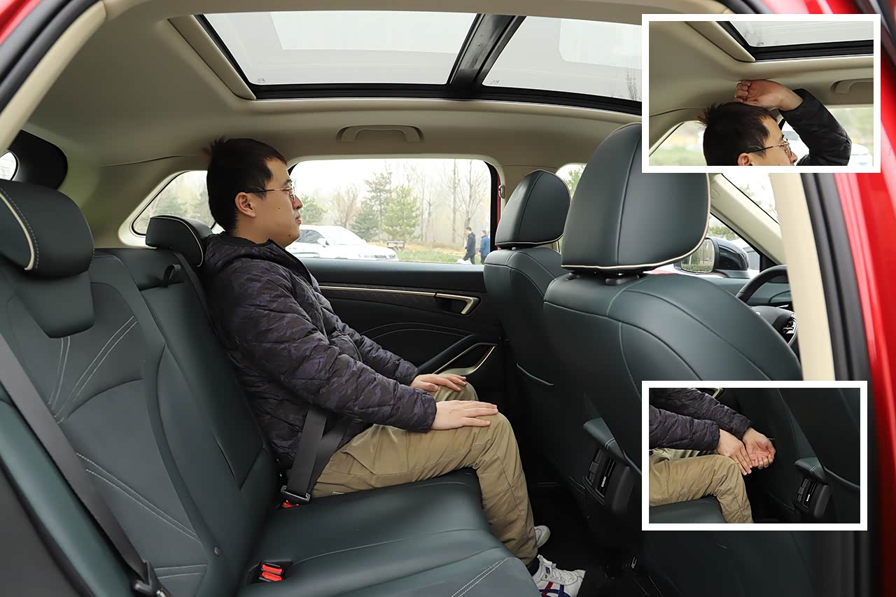 座椅包裹性适中,坐垫支撑性良好,空间方面表现属于中规中矩的那种。体验者身高为170cm,座椅调至最低,头部空间还有一拳。
