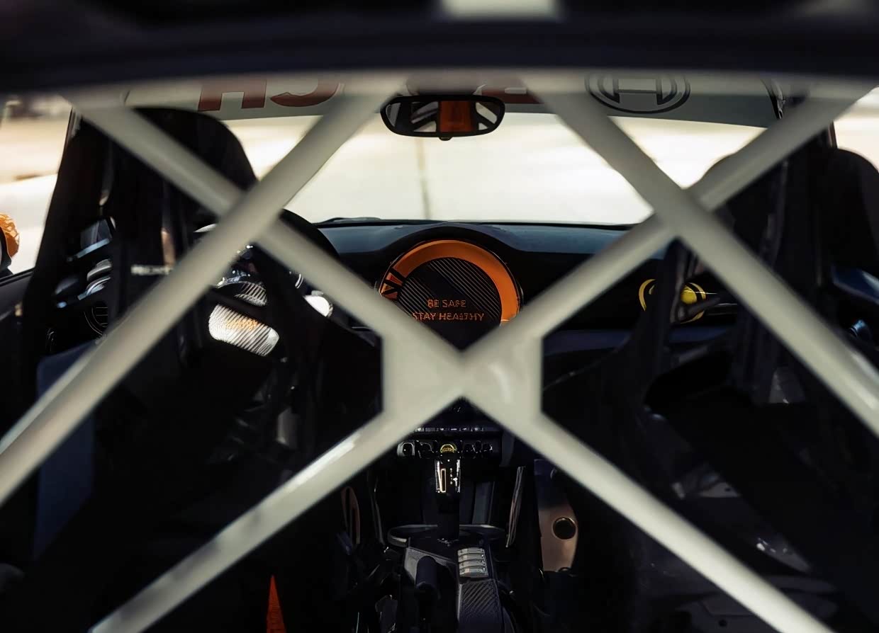 来到车内,为了轻量化,车里的内饰基本被拆光,中央的圆形中控屏改为碳纤维装饰板,非常吸引眼球。前排座椅上安装了六点式安全带,全方位保护车内人员安全,后排座椅拆除,安装了防滚架. 经过一番轻量化改装,该车的整备质量下降至1230Kg。