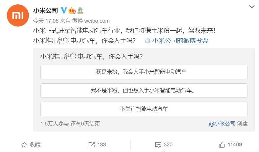 所以当这些米粉这么热情的告诉我的时候,我真的挺感动的。只要小米敢造,他们就敢买。这话听得真的,有时候也挺感动的。其实期待小米造车的朋友非常之多,在发布会前,我们小米公司的官微做了一个简单的调查。