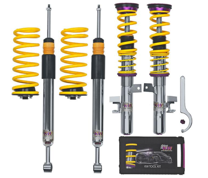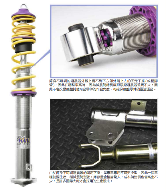 大多数的品牌的改装避震器都是采用的“全长筒身可调”的设计,相对这点来说,自然就有另外一种,就是“非全长筒身可调”的避震器设计方式,例如我们熟知的高端品牌德国KW避震器。我们就先来说一下这两种不同设计的差别。