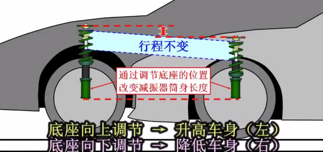 这两个不同的设计方式,都有什么优缺点呢?相信这也是车友们都非常关注的。“全长可调”避震器的有点在于调整车身高度的时候,不会改变避震筒的做功行程,也不需要预压弹簧,从而出现弹簧过硬的问题,而且只要是相同型号的避震筒,只要更换固定下座,就可以配套不同的车型,对于生产厂商来说这是一个降低生产成本的有力方式。缺点这是会因为避震筒的长度出现了变化,一般都是变短,从而影响底盘其他部件的配合做功和角度,比如防倾杆、李子串、轮胎定位角度等等底盘结构件,这些底盘结构件出现的问题,势必会影响到车子的行驶状态,如果调校不好,甚至会对车子的操控起到反作用。