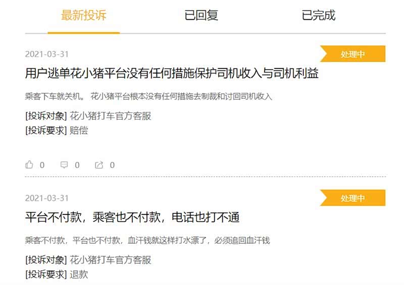 除了乘客外,花小猪打车另一用户群体——网约车司机也面临权益无法保障的困境。在新浪旗下的黑猫投诉平台显示,截至3月31日发稿前,有关花小猪打车的投诉量为6468个,其中有不少投诉信息来自平台司机,主要以乘客逃单不付车费、平台无保障措施为主。被阻拦下车的乘客心里苦,担心乘客逃单的司机心里也不痛快,面对用户的负面反馈,花小猪打车平台制度的规范和完善已迫在眉睫。
