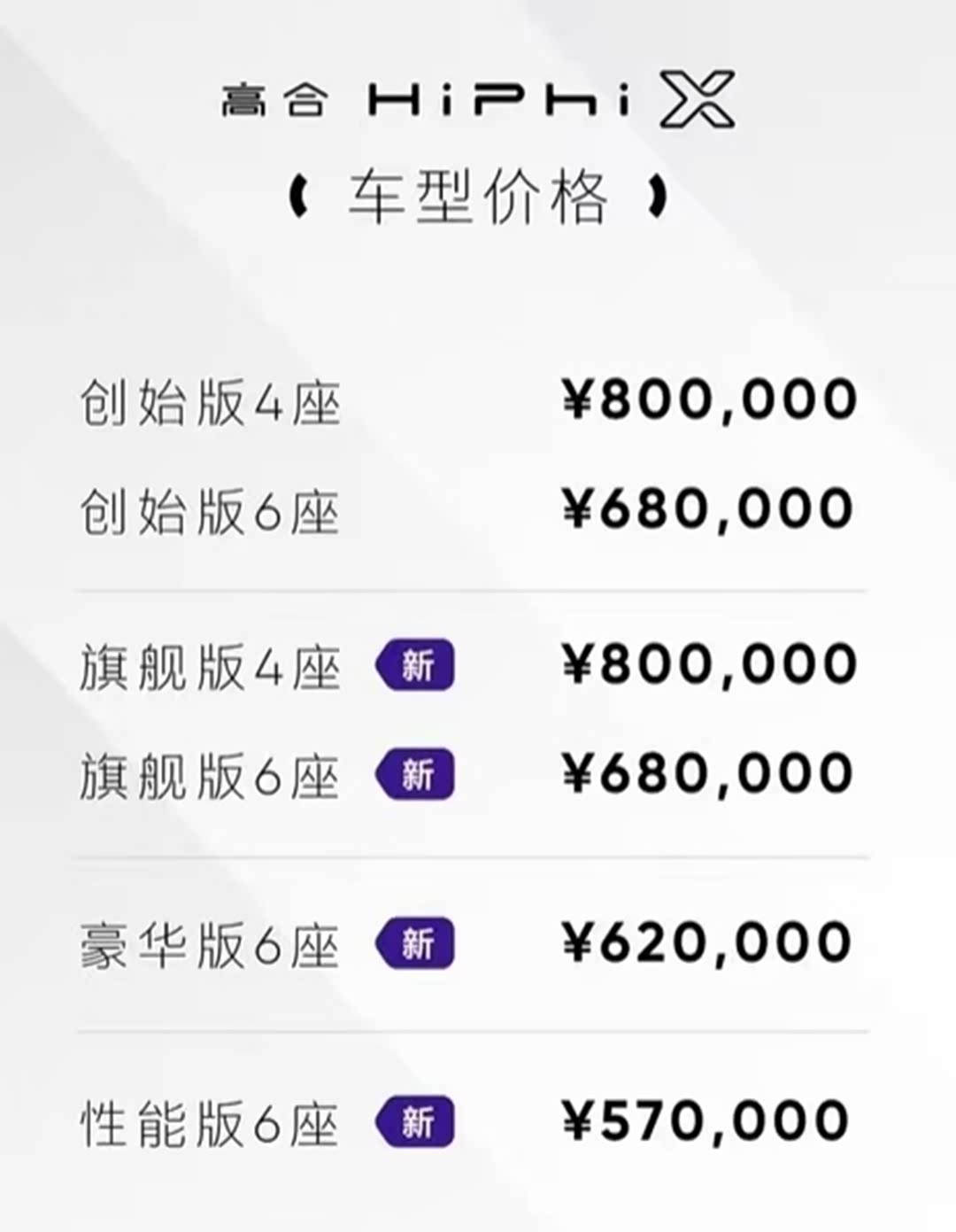 3月30日晚间,高合举办发布会,其首款量产车型HiPhi X增加四款新配置,分别为性能版6座、豪华版6座、旗舰版6座与旗舰版4座,售价区间为57-80万元。在去年9月份,高合已经率先推出了HiPhi X创始版车型,其售价与此次新增的旗舰型相同。新车将会在今年5月8日起正式交付。