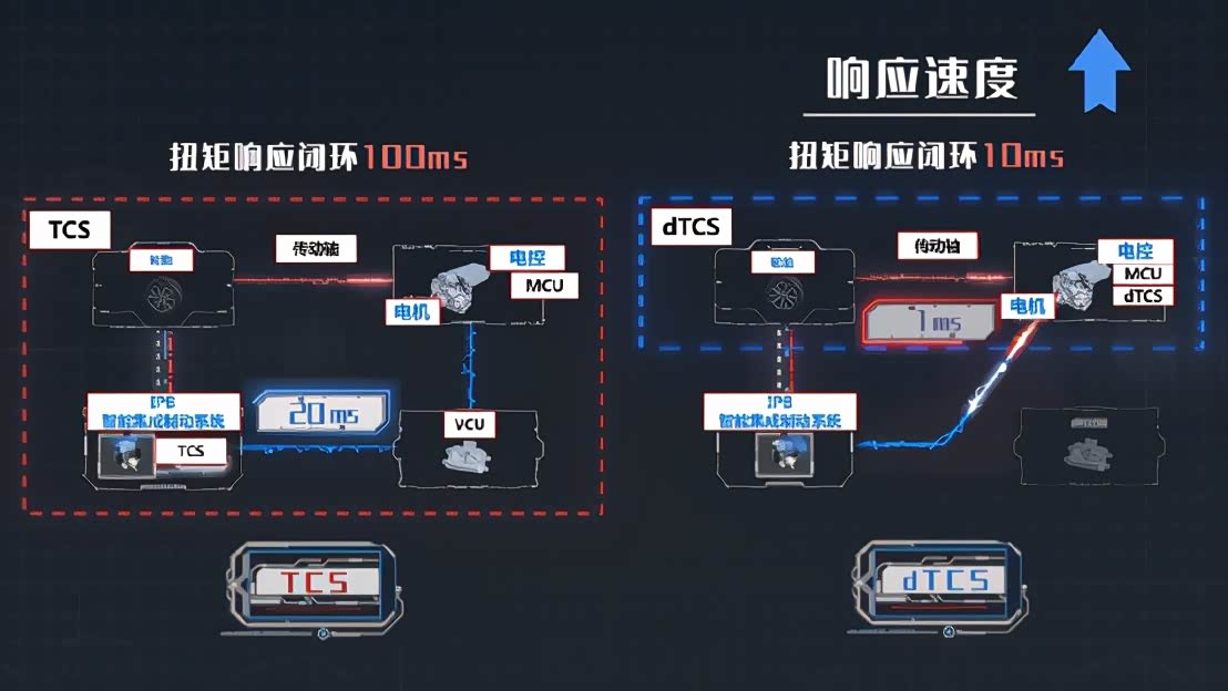 通过上图dTCS和TCS的工作路径对比,可以看出dTCS将牵引力控制系统植入到电机控制器内,直接跳过了以往TCS中VCU(整车控制器)处理信号这一流程,从而缩短工作路径,使整个扭矩响应时间从100毫秒减少至10毫秒,实现10倍提速。