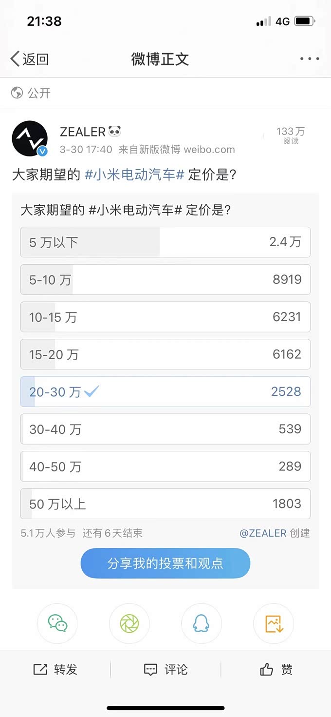 在发布会当天,zealer做了一个问卷,发现大部分参加问卷的人都希望小米汽车的价格区间在5万以内。
