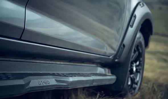车身侧面,18英寸的黑色合金轮圈以及外扩的轮眉,增加了新款车型的越野感,同时侧面台阶设计也十分独特,印有“ BT-50”的标识,彰显其独特的身份。