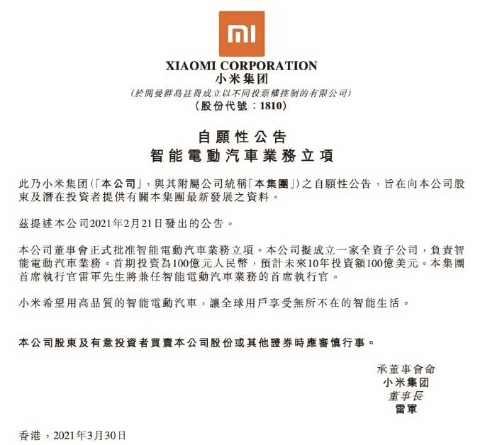 3月30日下午,雷军发了一条微博称:小米董事会正式批准了造车决议。然后预告,当晚发布会将说说造车的想法。