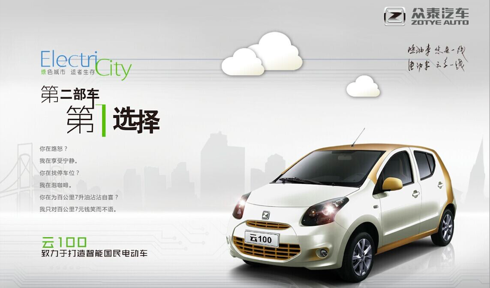在比亚迪发力之前,众泰已经是当时中国新能源的一线选手了。甚至在2014年,众泰云100还进入了全球电动车销量前十。